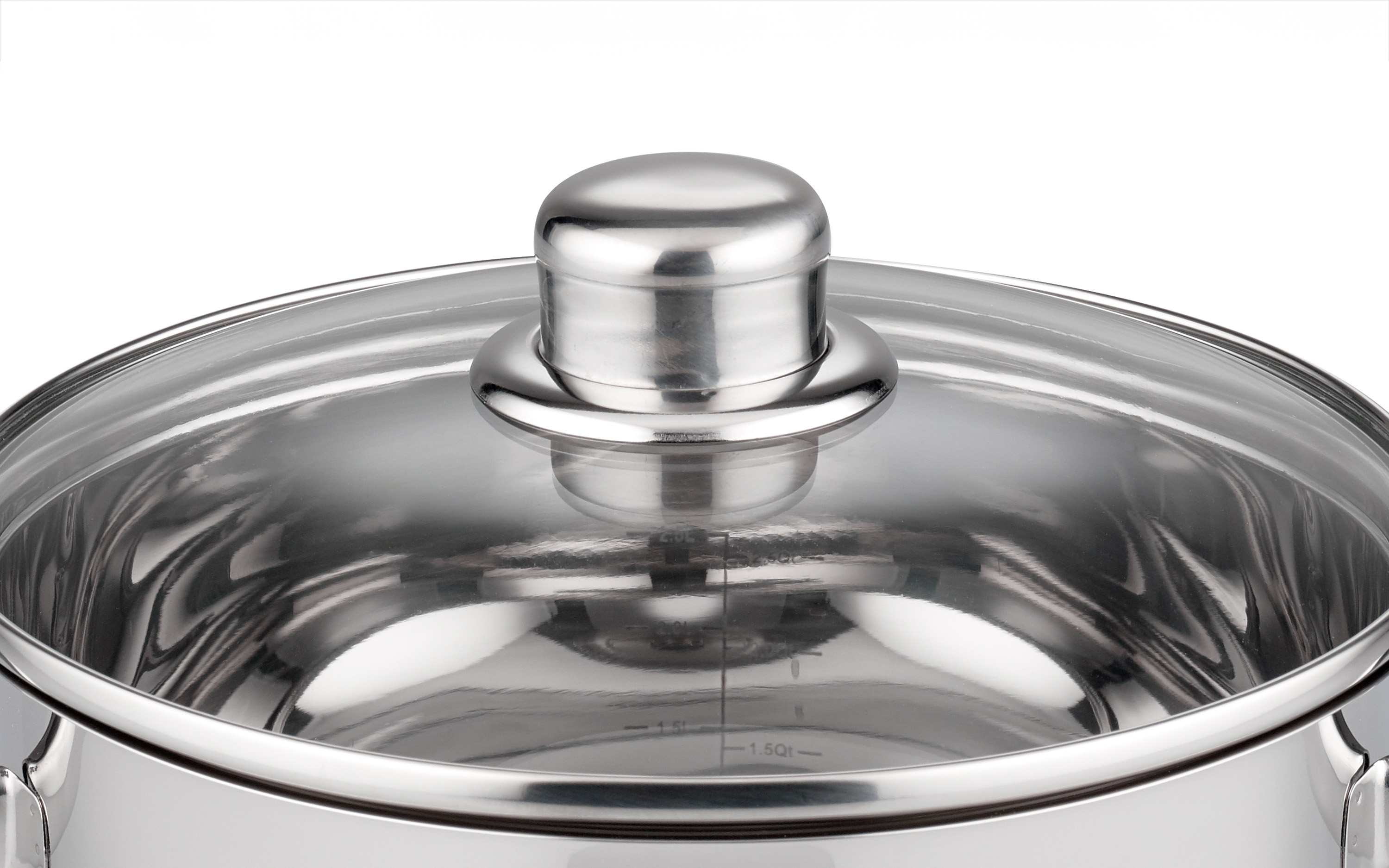 - Glasdeckel mit stoßfestem Edelstahlrand, hohler zylindrischer Edelstahlknopf mit Fingerschutzplatte, Edelstahlhohlgriffe