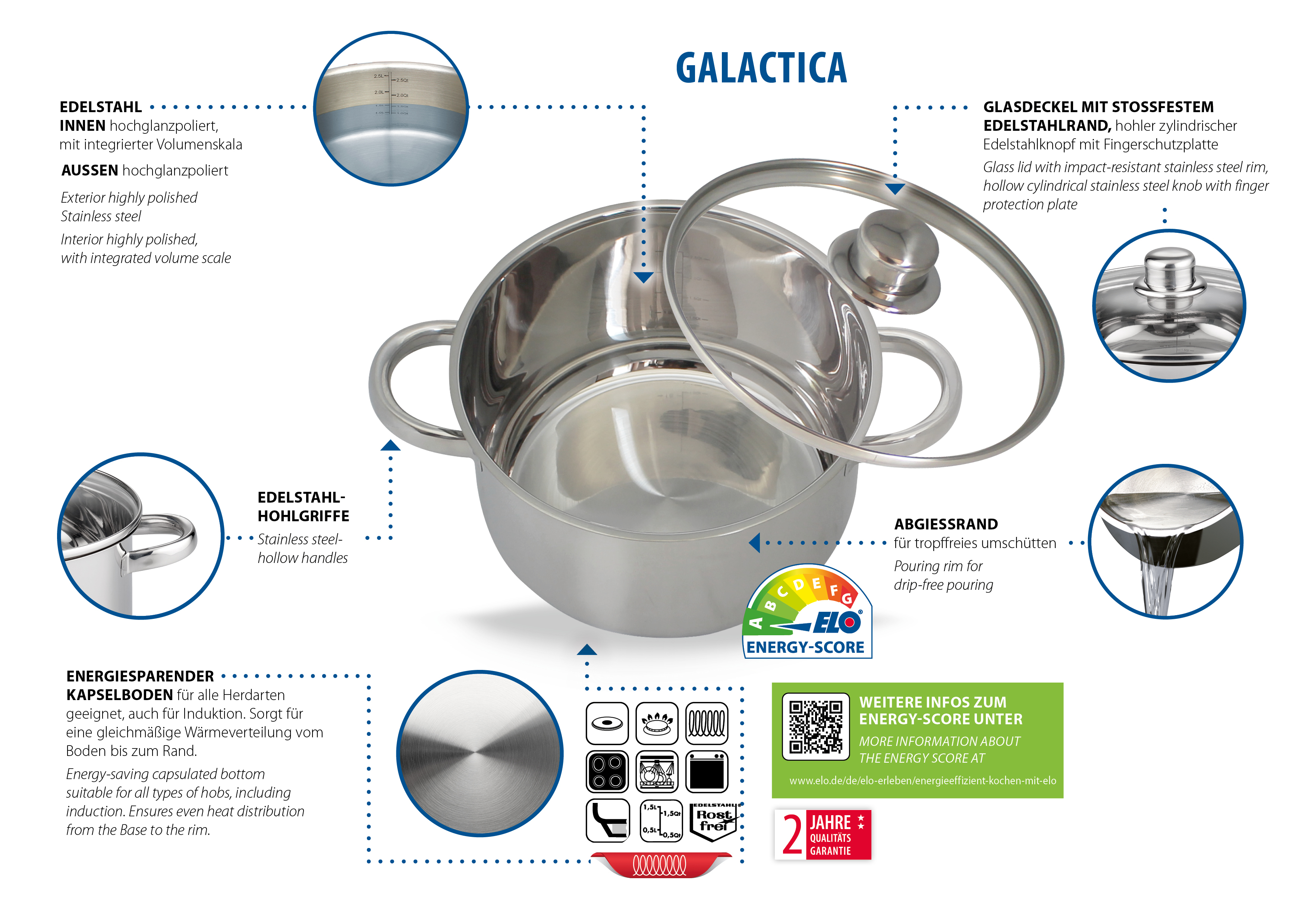 Schon fast puristisch, steht der Edelstahltopf aus dem ELO BASIC Programm, hochglanzpoliert, in der Küche. Zusätzlich punktet die zylindrische Form mit seinem Abgießrand, der ein tropffreies Abgießen garantiert. Die hitzereduzierenden Hohlgriffe aus Edelstahl werden nicht heiß. Innen überzeugt er mit hochglanzpolierter Oberfläche und einer praktischen Literskala zum einfachen Abmessen von Flüssigkeiten ohne weitere Hilfsmittel. Durch den Glasdeckel mit stoßfestem Edelstahlrand haben Sie die Speisen immer im Blick. Der energiesparende Kapselboden ist für alle Herdarten geeignet, auch für Induktion, und sorgt für eine gleichmäßige Wärmeverteilung.