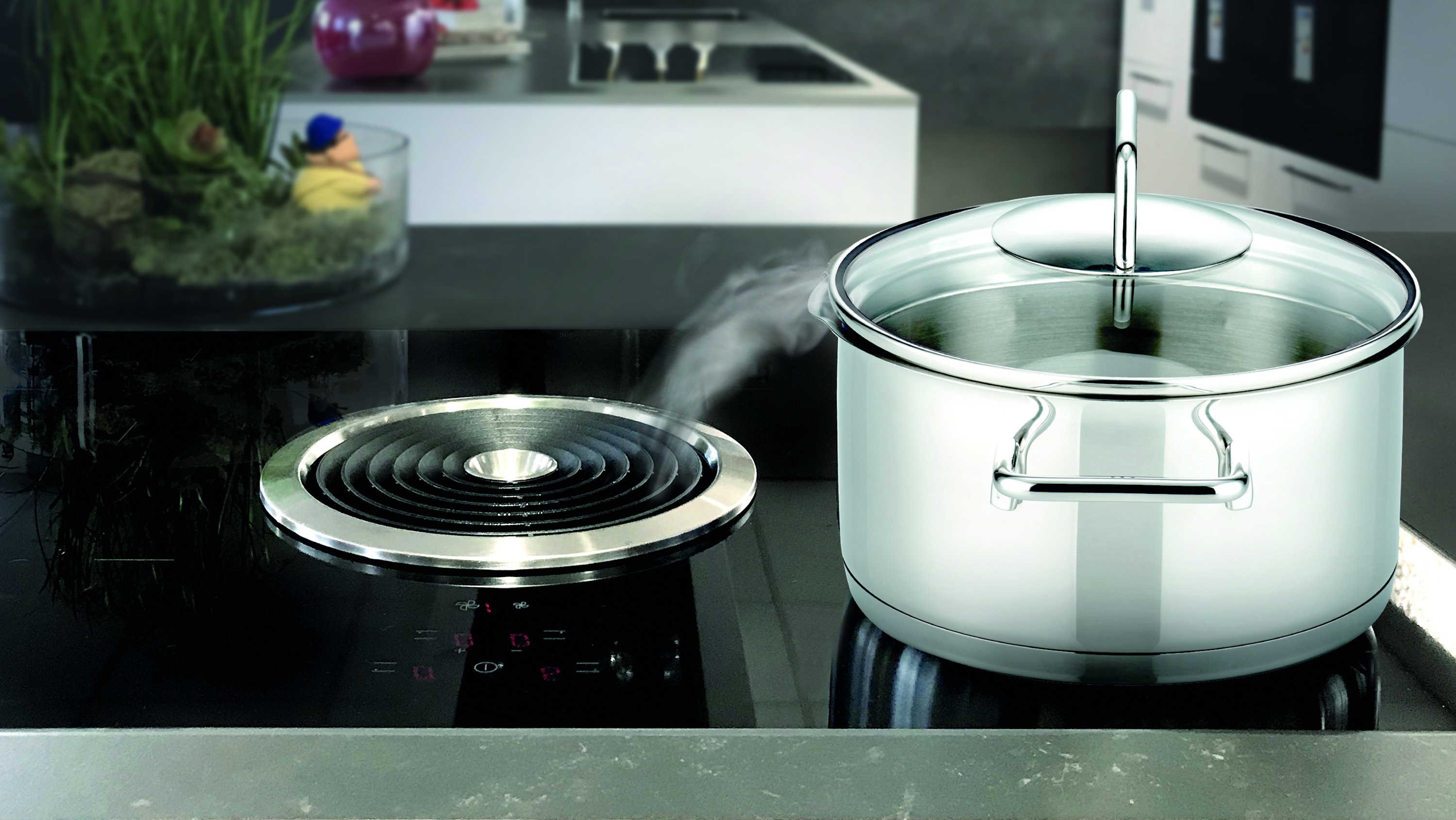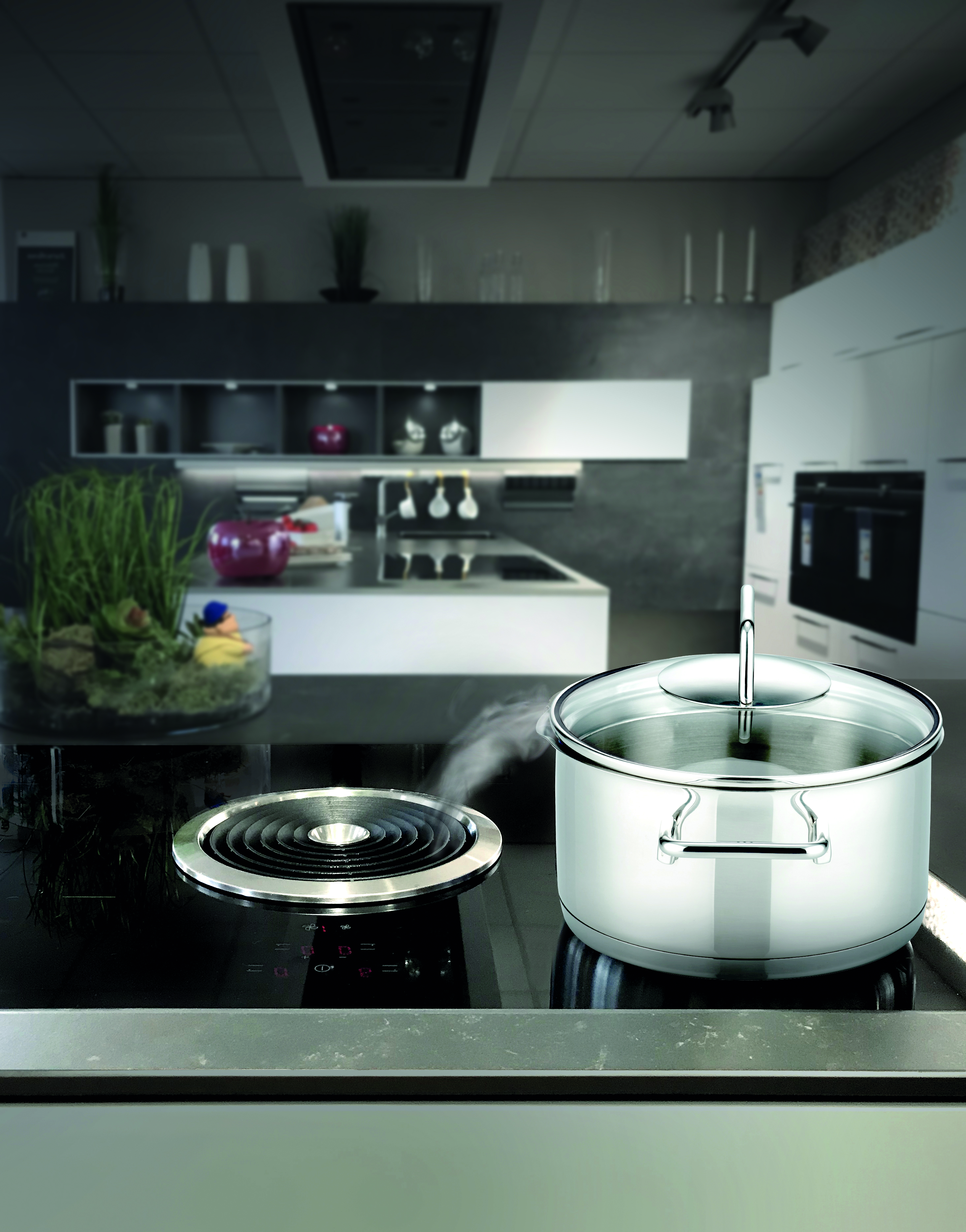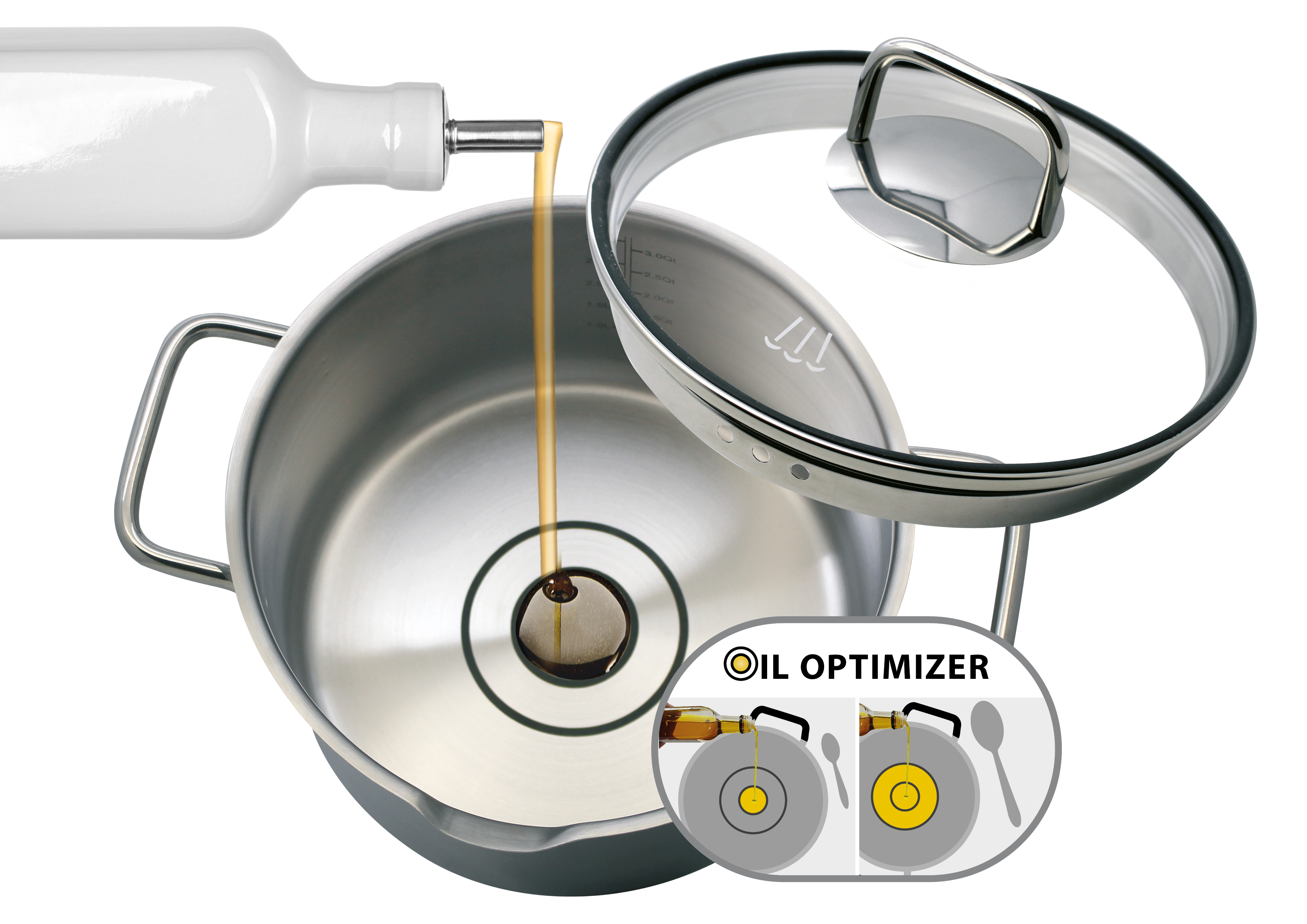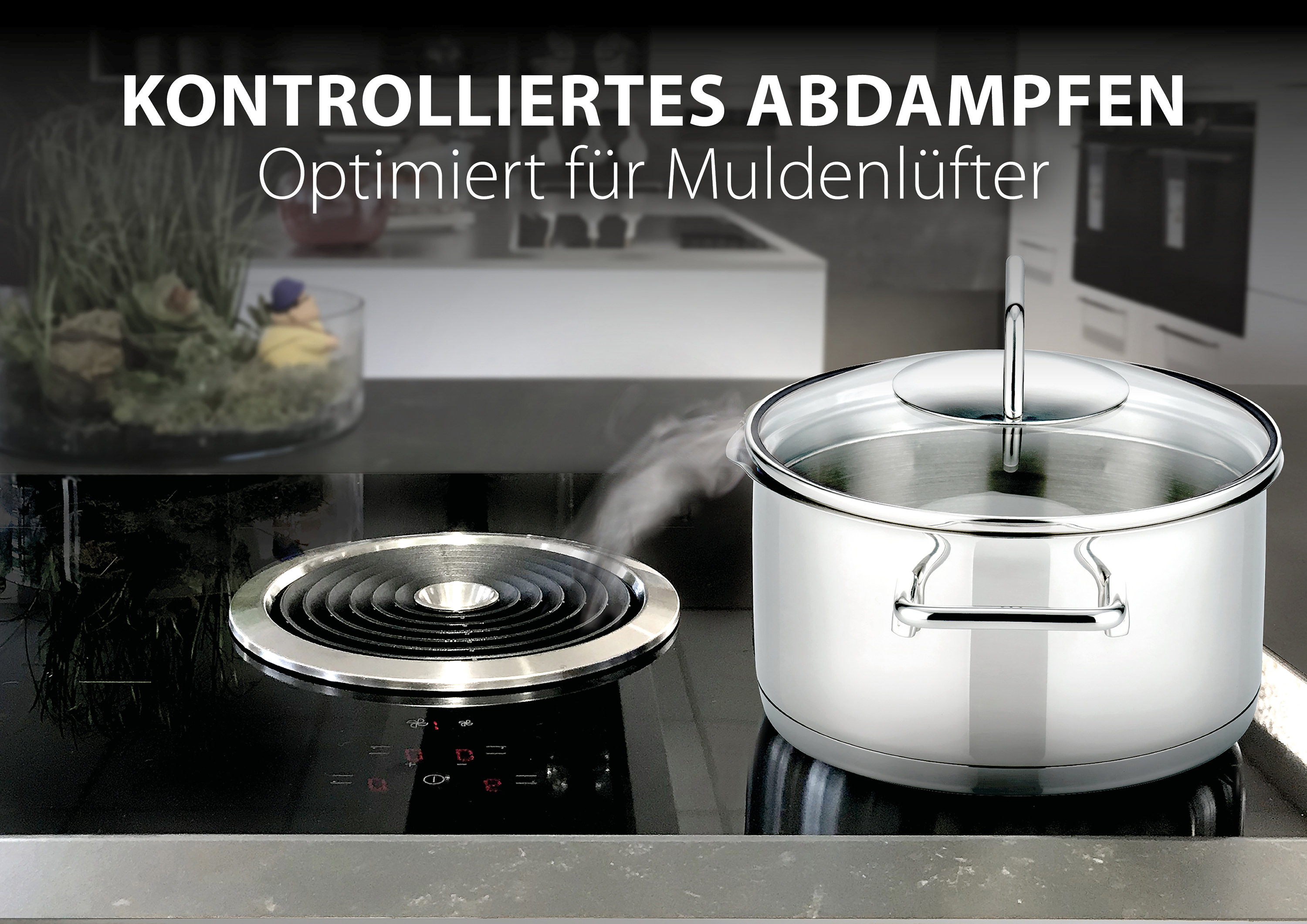 Neue Technologien fordern Innovation. Smart Steam ist das optimale Topf-Match für Ihren Herd mit Kochfeldabzug. Gezielt gesetzte Öffnungen in seinem breitkrempigen Deckel und eine entsprechende Ausbuchtung im Topfrand leiten den Dampf seitlich ab. Et voilà, so geht es für ihn ruckzuck abwärts in den Dunstabzug. Raffiniert, durch leichtes Drehen des Deckels kann das Abdampfen wohl dosiert werden. Sein grauer Silikonring sorgt für einen soften Sitz. Unangenehme Essensgerüche in der Küche waren gestern.