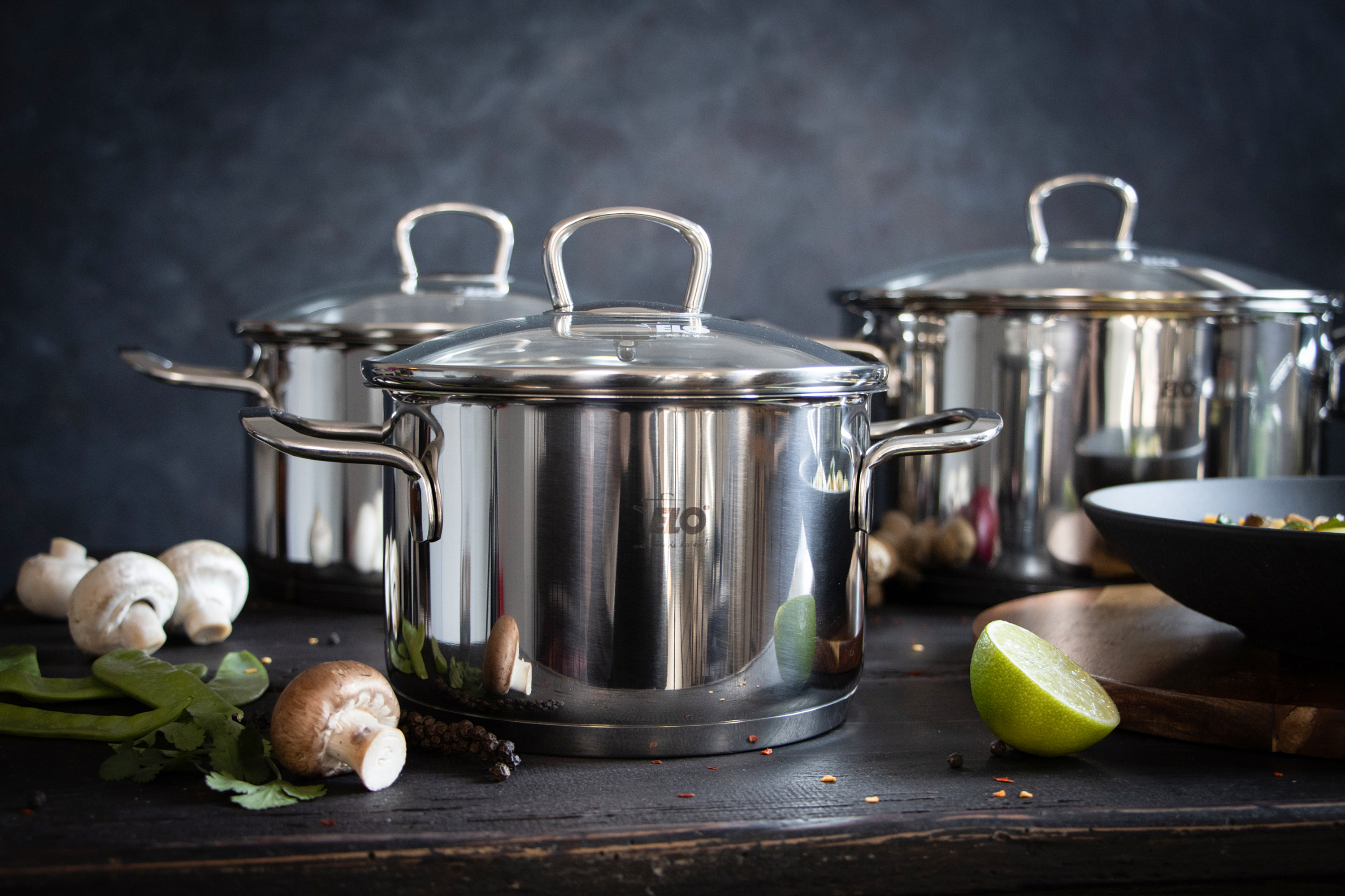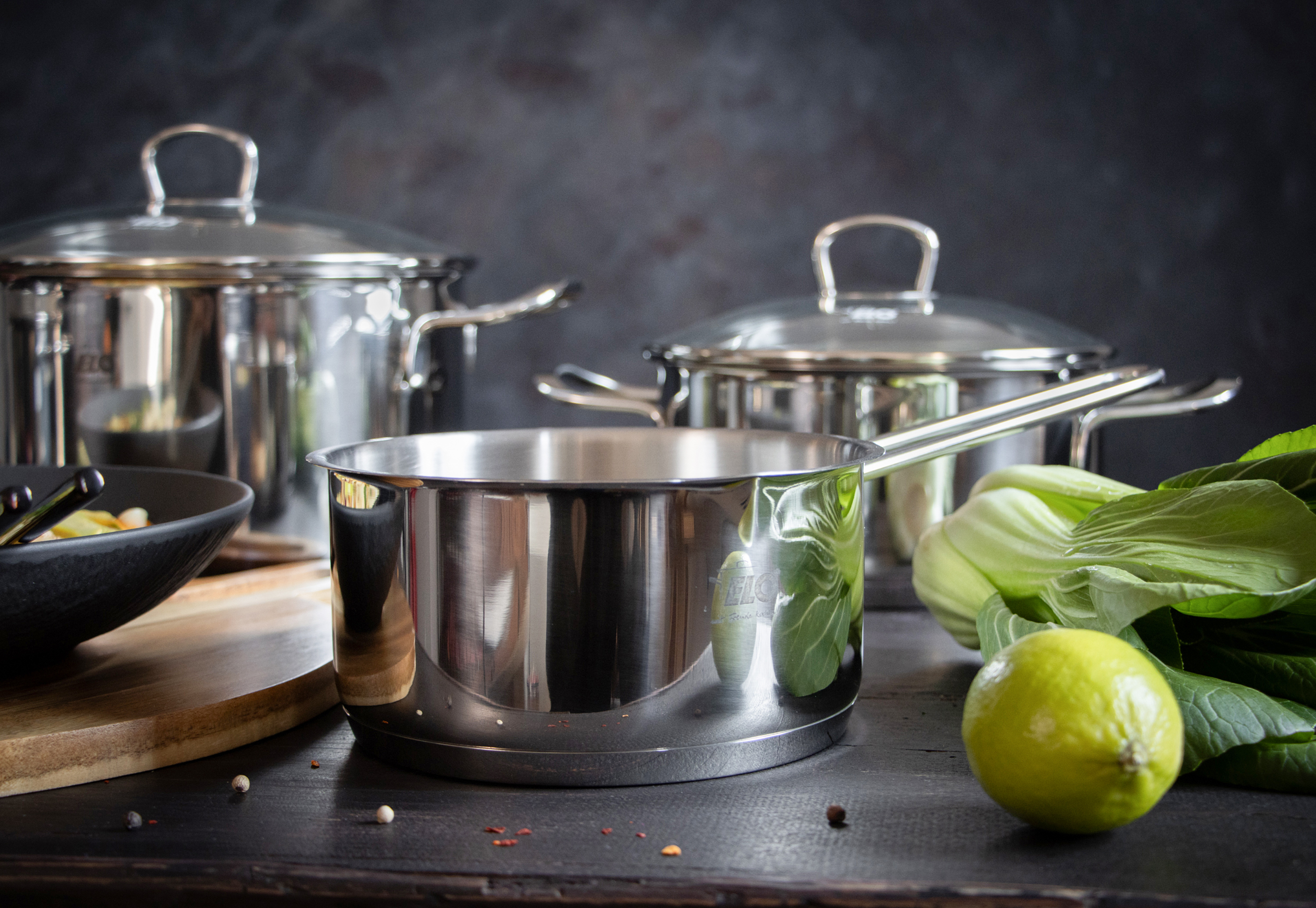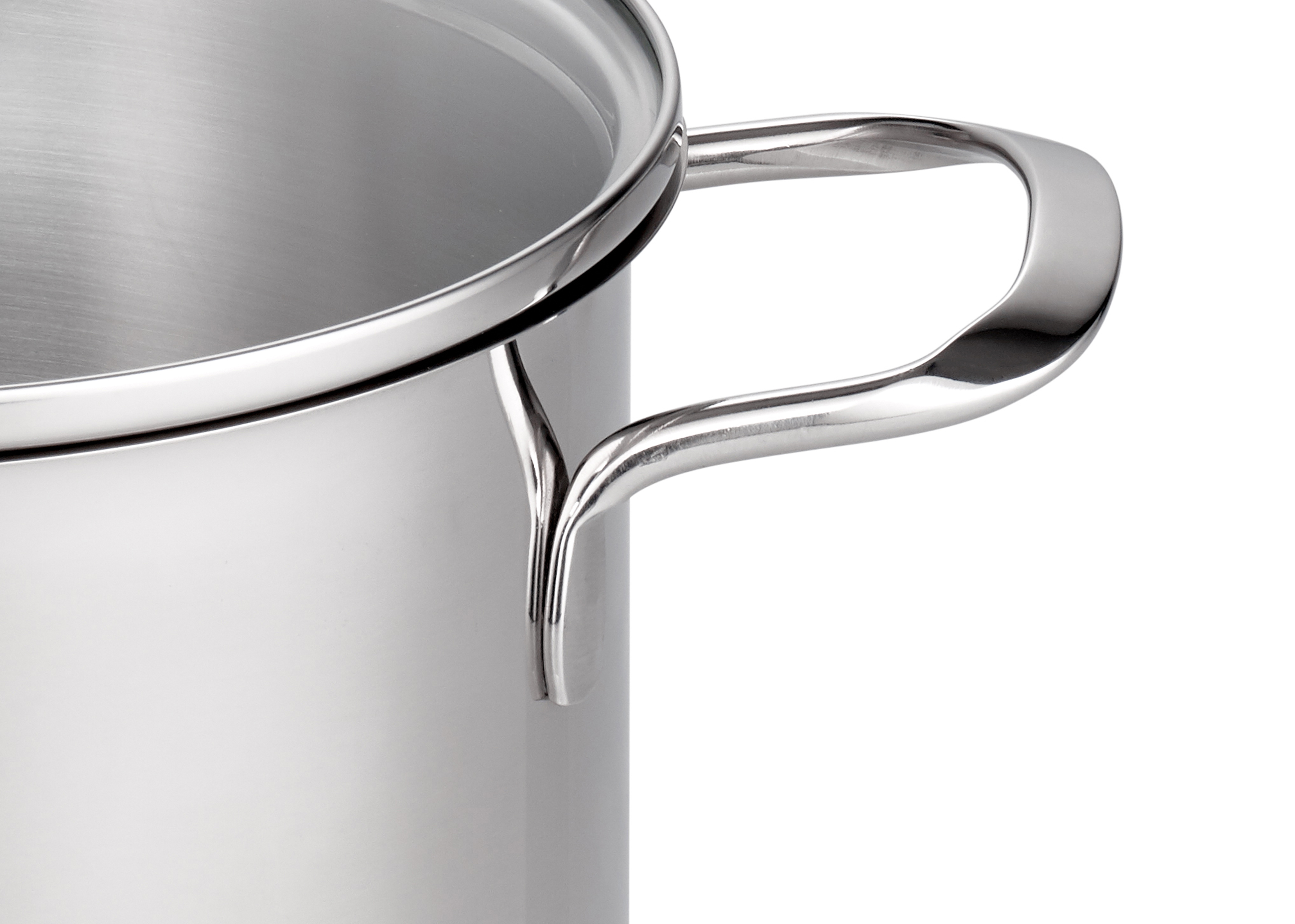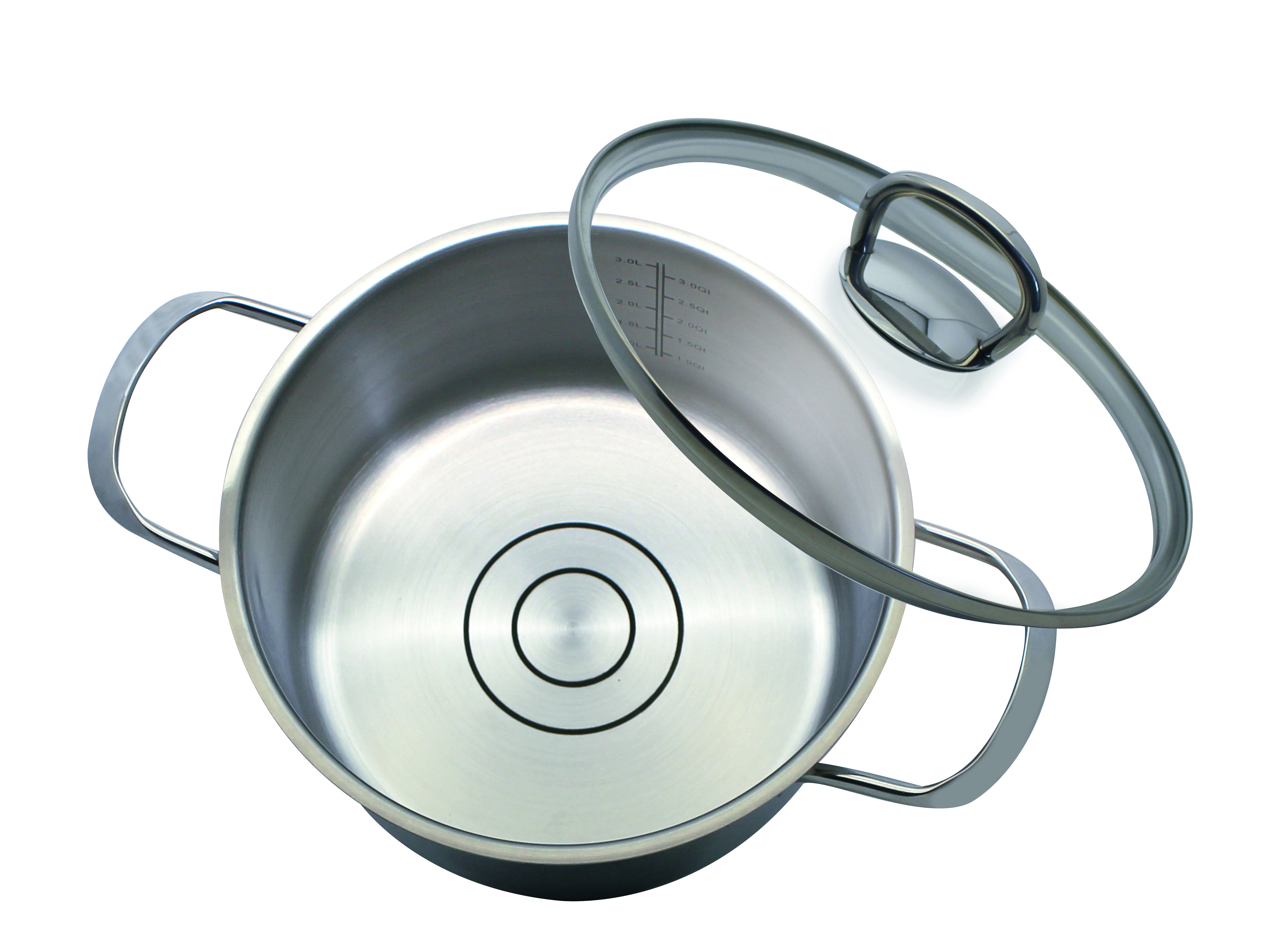 hier strahlt einfach alles hochglanzpoliert von Außen. Die Töpfe bestehen aus rostfreiem Edelstahl 18/10, welcher auch spülmaschinengeeignet ist. Von innen satiniert verfügen sie über eine Volumenskala, an der sich schnell und einfach Flüssigkeiten abgemessen lassen. Die geschweißten Edelstahl-Drahtgriffe liegen gut in der Hand und durch den Glasdeckel, mit stoßfestem Edelstahlrand kann man die Speisen gut und problemlos beobachten. Der energiesparende Kapselboden ist für alle Herdarten geeignet, auch für Induktion und sorgt für eine gleichmäßige Wärmeverteilung.